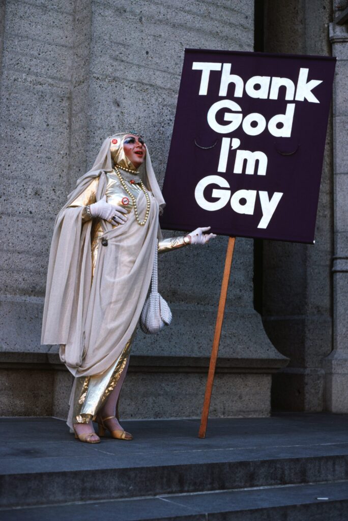 Thank God I’m Gay (Gilbert Block as Sister Sadie, Sadie, the Rabbi Lady greeting churchgoers, San Francisco, June 1983);