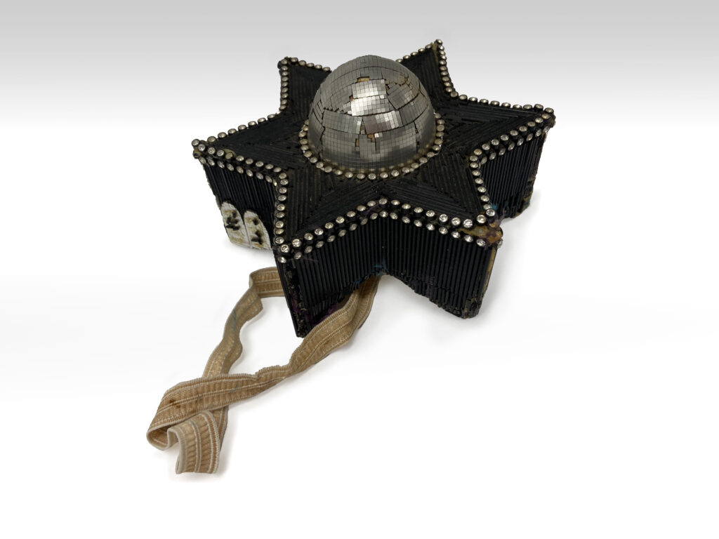 Synagogo Hat (Californië, VS, ca. 1980), vervaardigd door Gilbert Block; materiaal: Karton, strass-steentjes en zwarte glaskralen
