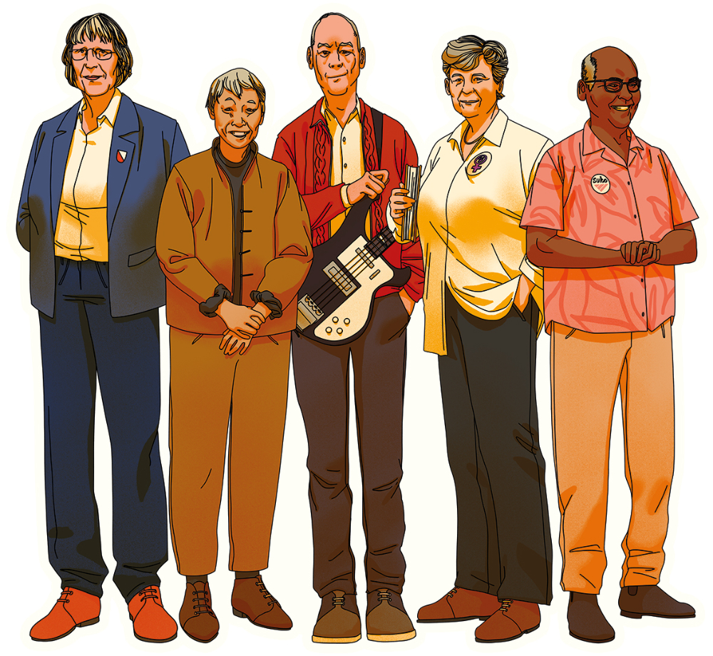 Afbeelding: de vijf verschillende Roze Reuzen – v.l.n.r. en boven naar beneden: Twie Tjoa, Corine van Dun, Marty van Kerkhof, Maaike Meijer, Lionel Jokhoe. Geïllustreerd door Avalon Nuovo