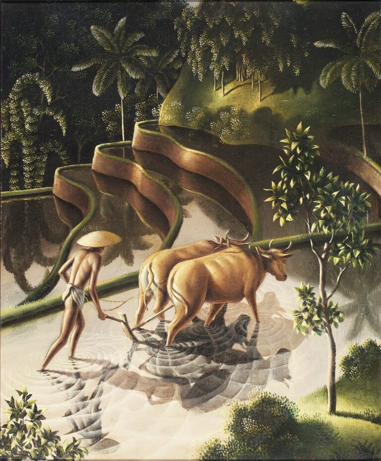 Walter Spies: Javanese ploughing farmer in a rice field, 1929
