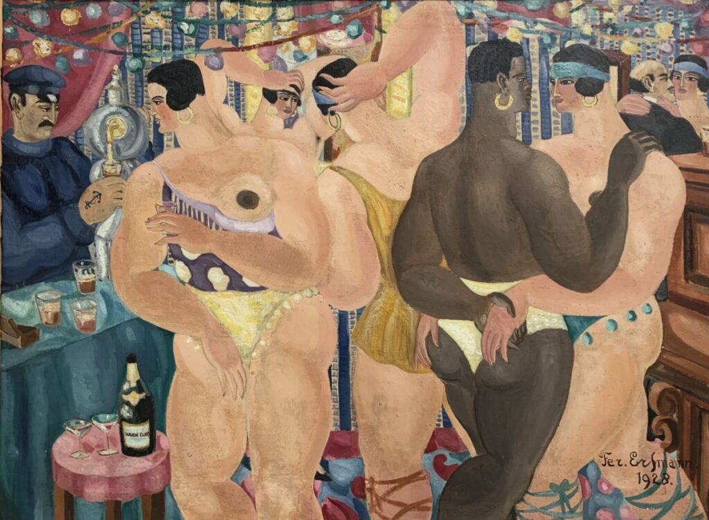 Deze straat bevond zich vlak bij de haven, en was met haar uitgaansgelegenheden in de jaren 1920 een hot spot voor zeelieden, sekswerkers en ook veel queer mensen.2 Rechts zien we twee feminiene figuren die op intieme wijze met elkaar dansen. Wellicht heeft Erfmann zich zelfs laten inspireren door een bezoek aan Café ‘t Mandje, een van de eerste homocafés van Nederland, dat één jaar daarvoor zijn deuren had geopend.3