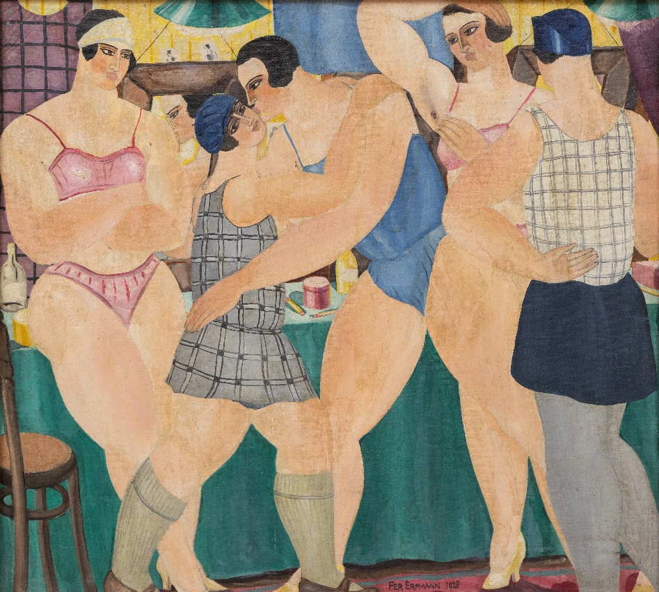 B: Ferdinand Erfmann, Vrouwen in slaapkamer, 1928, olieverf op doek, 52,6 x 57,5 cm, Frans Hals Museum