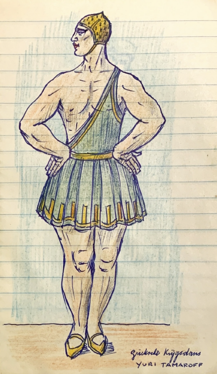 H: Ferdinand Erfmann, Aantekeningenboekje met schetsen en kostuumontwerpen, ca. 1950, pen en kleurpotlood op papier, Archief (verzameling) Ferdinand Erfmann (NL-HaRKD-0304), RKD – Nederlands Instituut voor Kunstgeschiedenis. Foto gemaakt door de auteur.