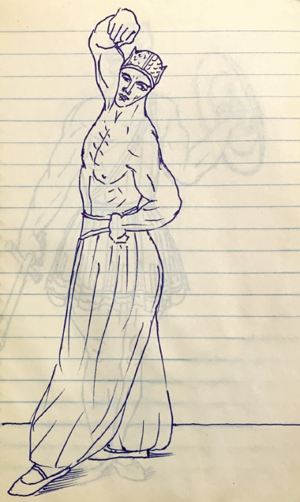 F: Ferdinand Erfmann, Aantekeningenboekje met schetsen en kostuumontwerpen, ca. 1950, pen en kleurpotlood op papier, Archief (verzameling) Ferdinand Erfmann (NL-HaRKD-0304), RKD – Nederlands Instituut voor Kunstgeschiedenis. Foto gemaakt door de auteur.