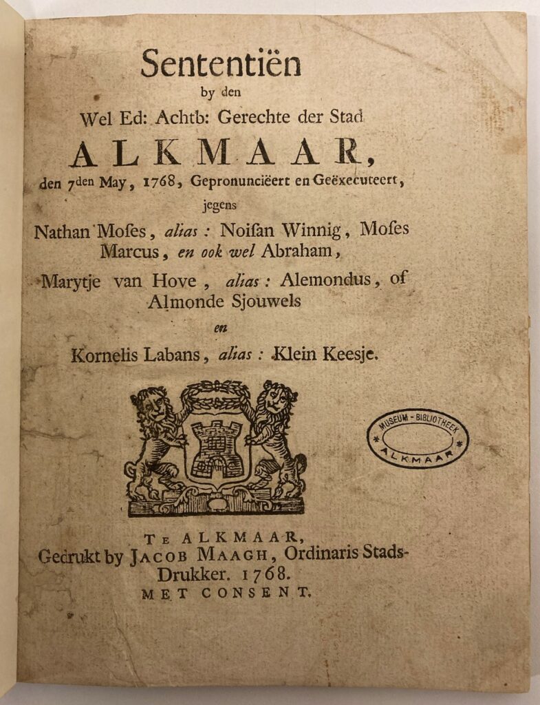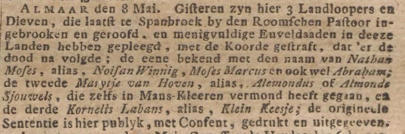 Lange tijd bleef Marijtje ongestraft, maar toen een van haar bendegenoten, de beruchte Nathan Moses, in het voorjaar van 1768 in Alkmaar werd opgepakt, wist de schout van Alkmaar ook haar snel te vinden, evenals mededader ‘Klein Keesje’ Labans.